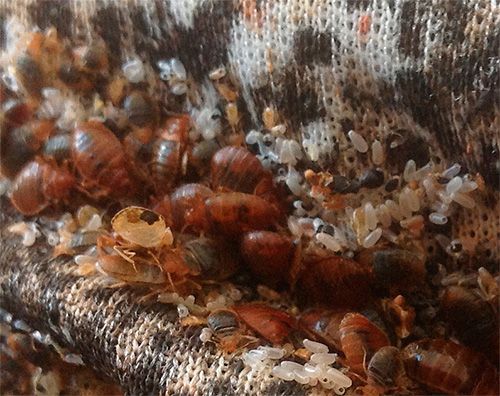 Клопы скапливаются в наиболее безопасных для себя местах и там же размножаются, живут и справляют нужду. Такие места легко увидеть на светлой деревянной мебели или светлой обивке — это множественные черные точки (циста), разбавленные наличием яиц клопов и шкурками, которые они сбрасывают по мере своего взросления во время линьки.